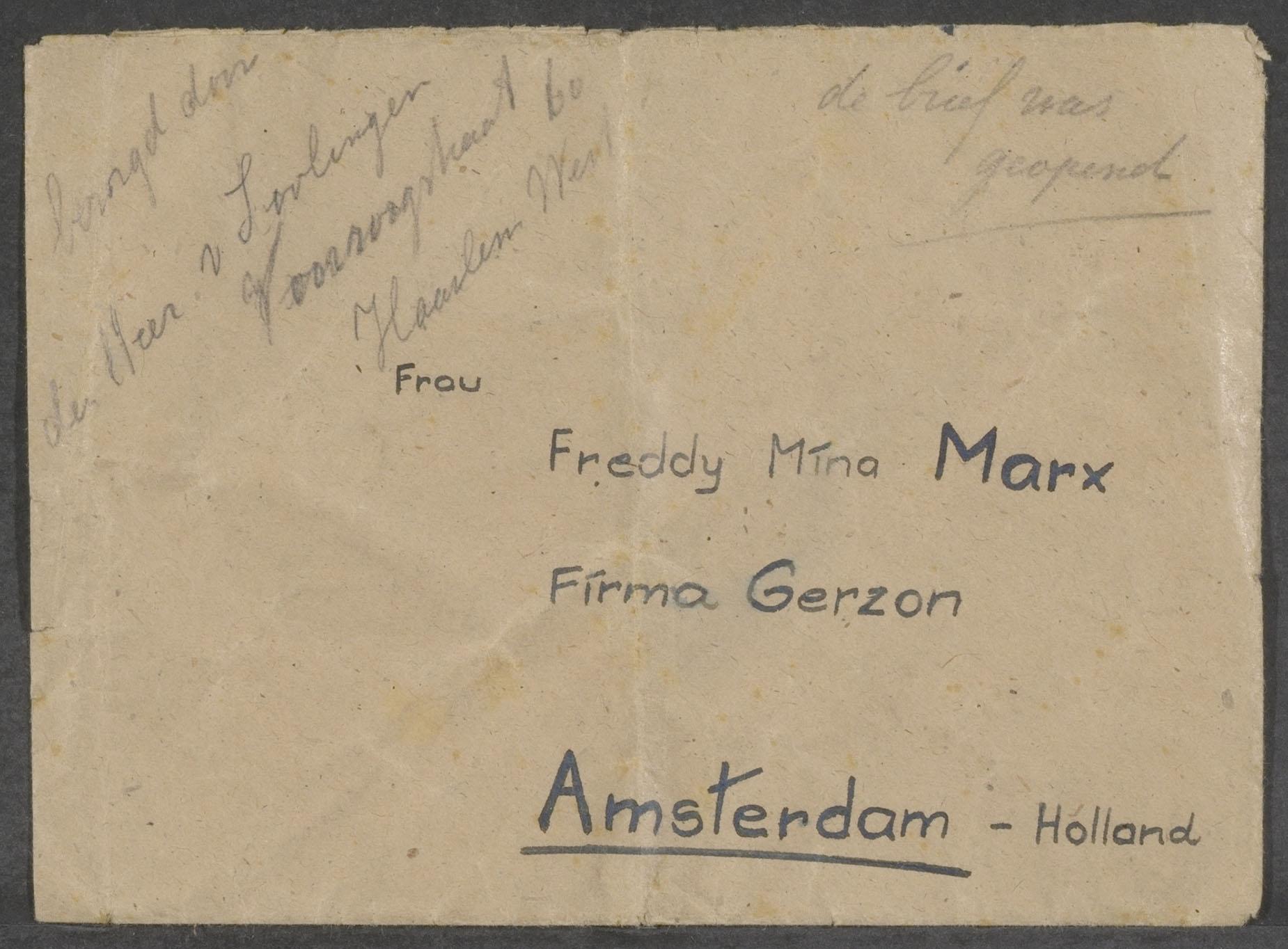 Brief van Carla Müller-Seidl aan Mina Marx-Stibbe meegenomen door iemand uit concentratiekamp Dachau, 1945