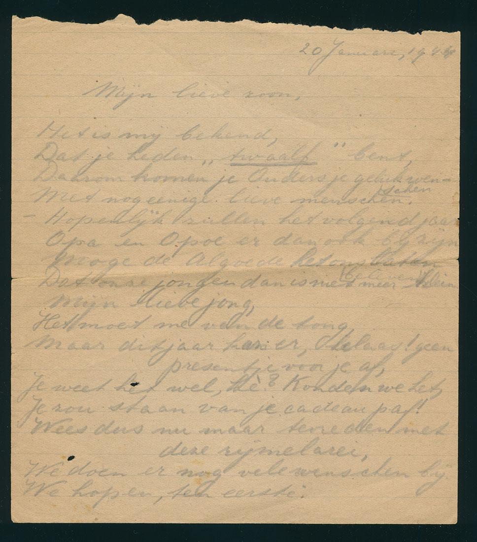 Manuscript geschreven door Sientje Nathans-Kaufmann voor de 12e verjaardag van haar zoon Isidoor tijdens hun onderduik, 1944