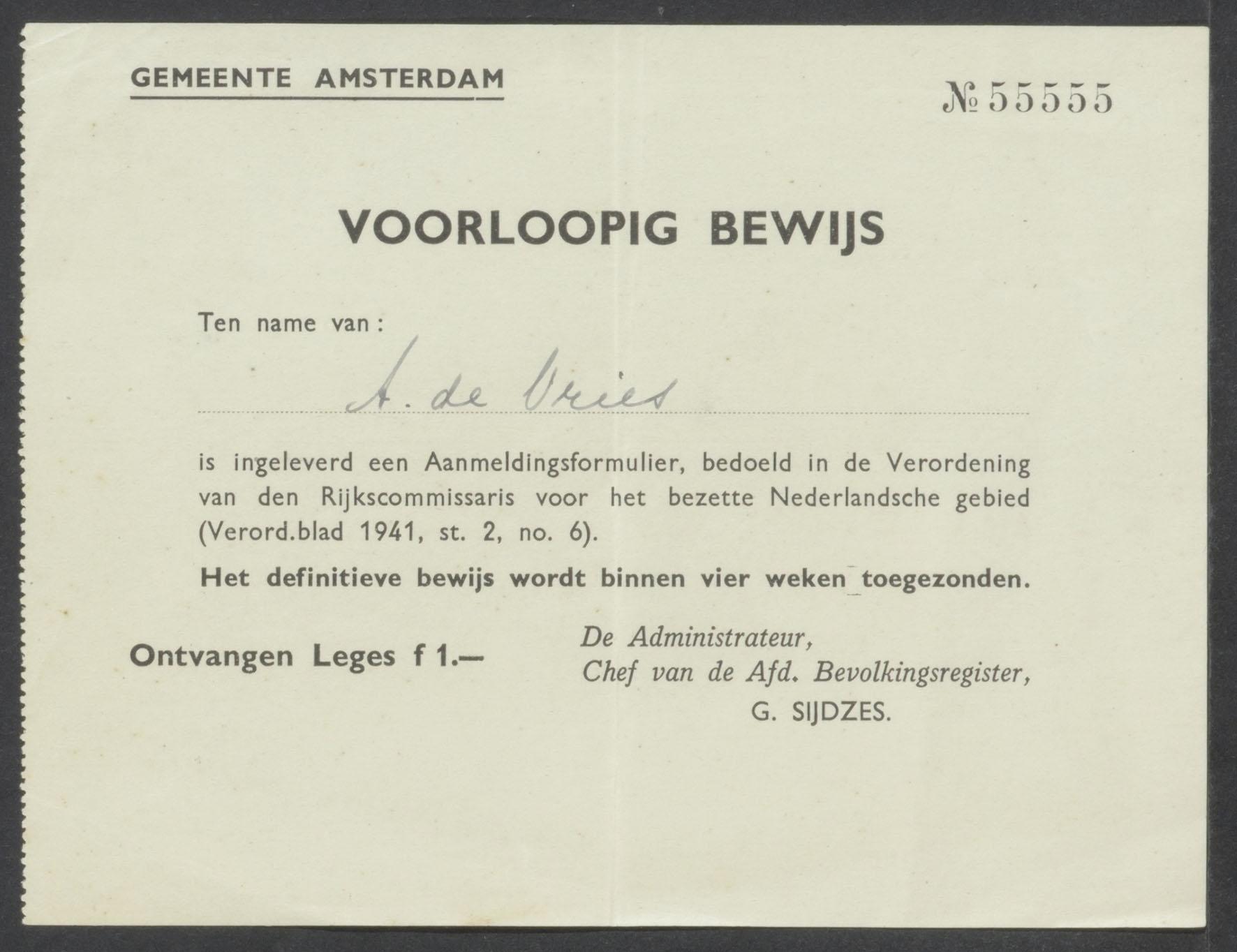 Voorlopig bewijs van aanmelding als joods persoon ten name van Arnold de Vries, 1941