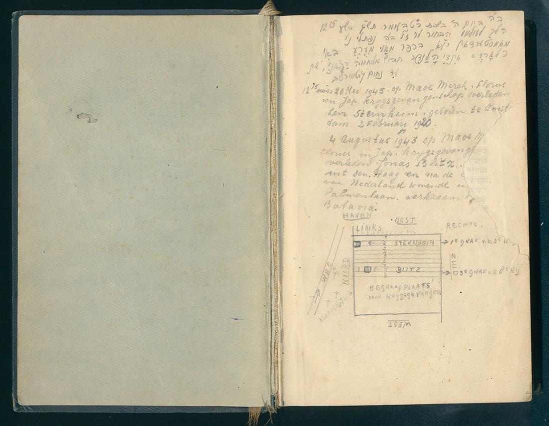 Tenach met achterin met potlood gemaakte aantekeningen over het overlijden van Levi Sternheim in een Japans interneringskamp en een schetsje van de begraafplaats, 1943