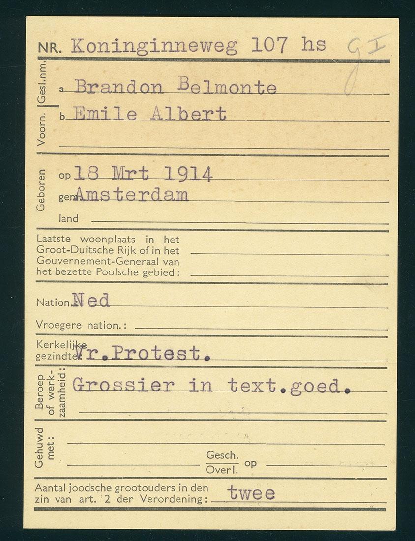 Aanmeldingbewijs voor persoon van 'geheel of gedeeltelijk joodschen bloede' ten name van Emile Albert Brandon Belmonte, 1941