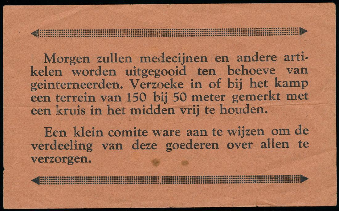 Tweetalig document m.b.t. dropping van goederen en medicijnen bij een concentratiekamp, waarschijnlijk in Nederlands-Indië, 1945