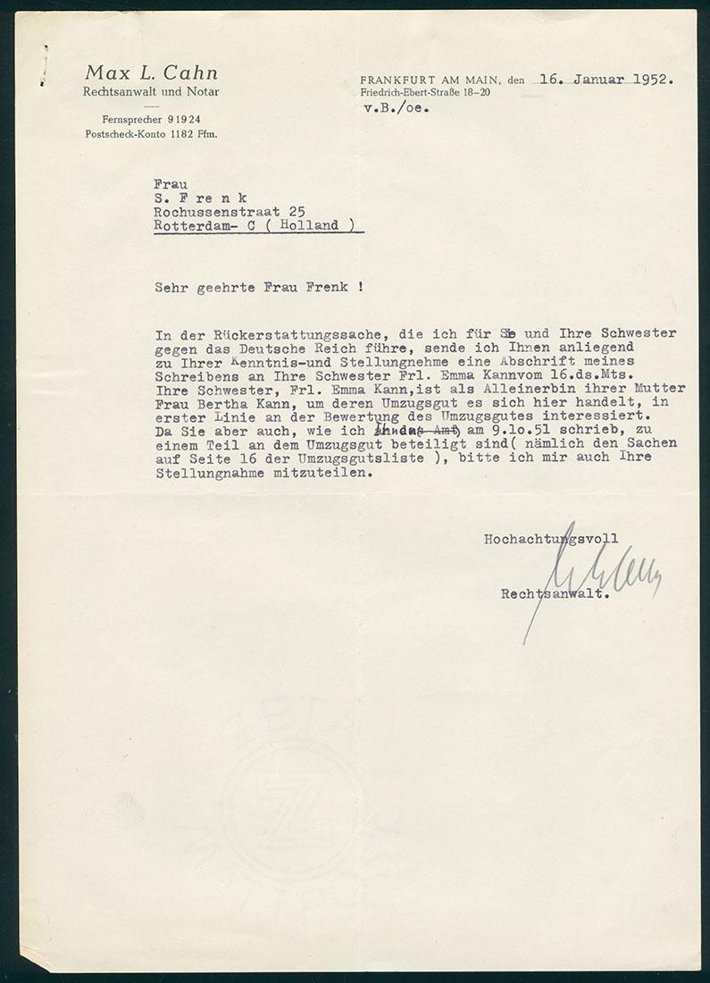 Inhoud o.a.: - ontslagbrief voor Liselotte Frenk-Kann van Kaufmann's Huidenhandel NV (kopie), Rotterdam 14-11-1941 - afschrift uit het Handelsregister Kamer van Koophandel, Rotterdam, 8 augustus 1995 - brief van Emma E. Kann uit New York, 11-05-1958. Emma is een zuster van Liselotte Frenk-Kann - overboekingen van Deutsche Bank - correspondentie met mr. W. Diamand over claims in Duitsland in te dienen - brief (doorslag) met verzoek geld over te maken door Deutsche Bank voor onderhoud graven op de Joodse Begraafplaats te Frankfurt am Main, maart 1958 - beslissingen inzake 'Wiedergutmachung' en restitutie, Wiesbaden 1957, 1958 - beschrijving (Duits) van hetgeen Myra Frank en haar broer Salomon Frenk in de oorlog hebben meegemaakt t.b.v. aanvraag schadevergoeding en 'Wiedergutmachung' - brieven van advocaat en notaris Max L. Cahn te Frankfurt am Main, 1951/52. Hij schrijft o.a. over de erfenis van Bertha Kann. - Het Synagogaal Ressort Rotterdam schrijft over de mogelijkheid tot schadevergoeding, 1955 - Simon Rotsteeg verklaart dat Liselotte Frenk-Kann de Jodenster heeft gedragen - Nederlands Juristenblad 17 september 1955 met artikel van mr. dr. W. Diamand - knipsel uit het NIW 13 juli 1956: Nieuwe Duitse schadevergoedingswet