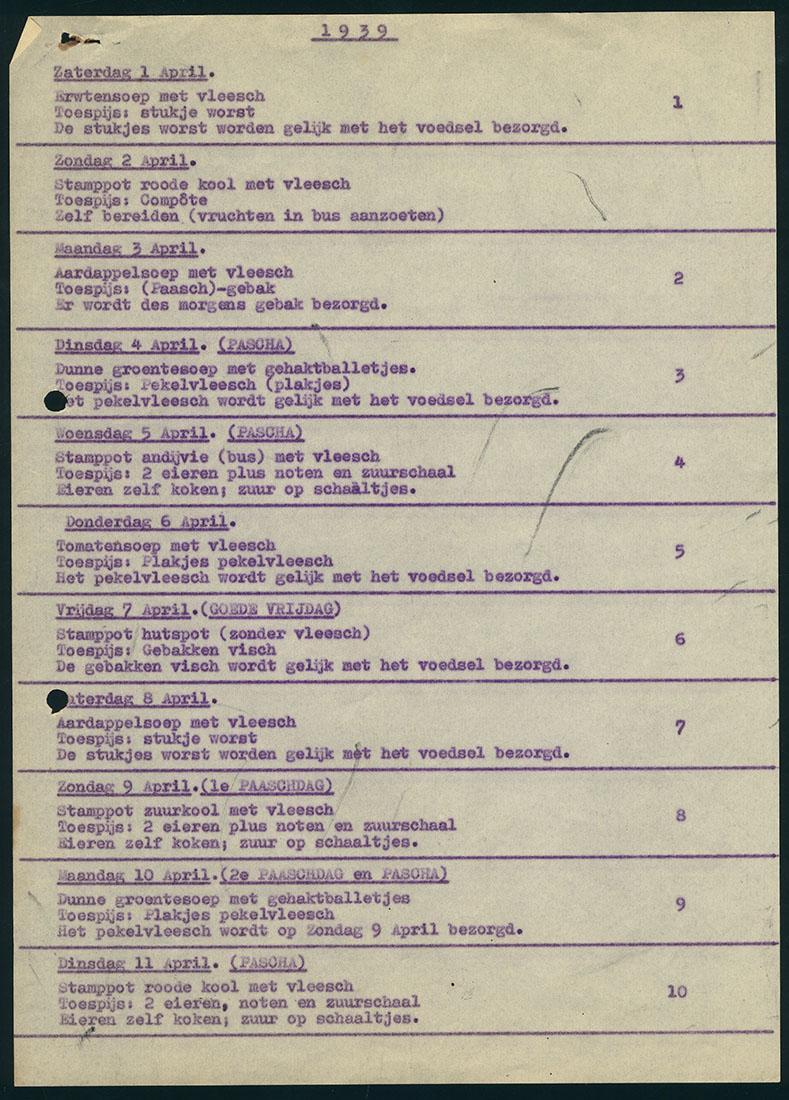 Menulijsten voor enkele weken van de maanden april, mei en juli 1939 van het Joods Vluchtelingenkamp Quarantaine-Inrichting Zeeburg