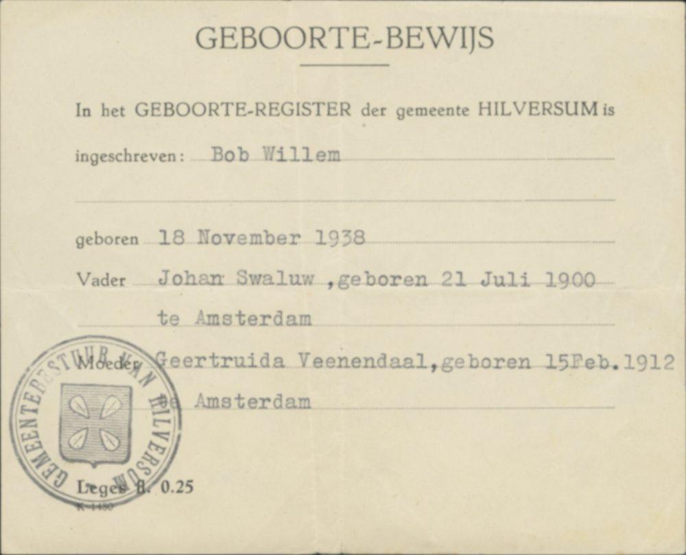 Vervalst geboortebewijs van Bob Willem Swaluw, zoon van Johan Swaluw en Geertruida Veenendaal, 1938
