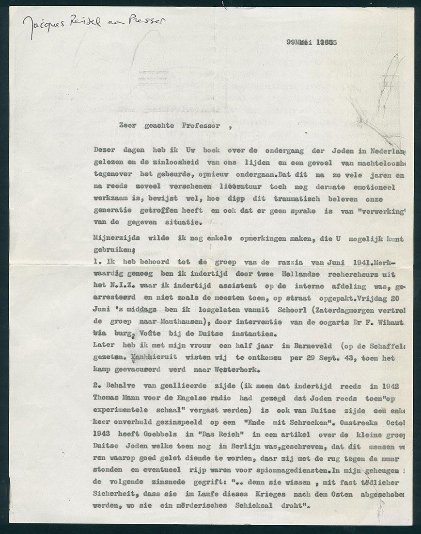 Brief van Jacques Reisel aan Jacques Presser over diens net verschenen boek "Ondergang"', 1965