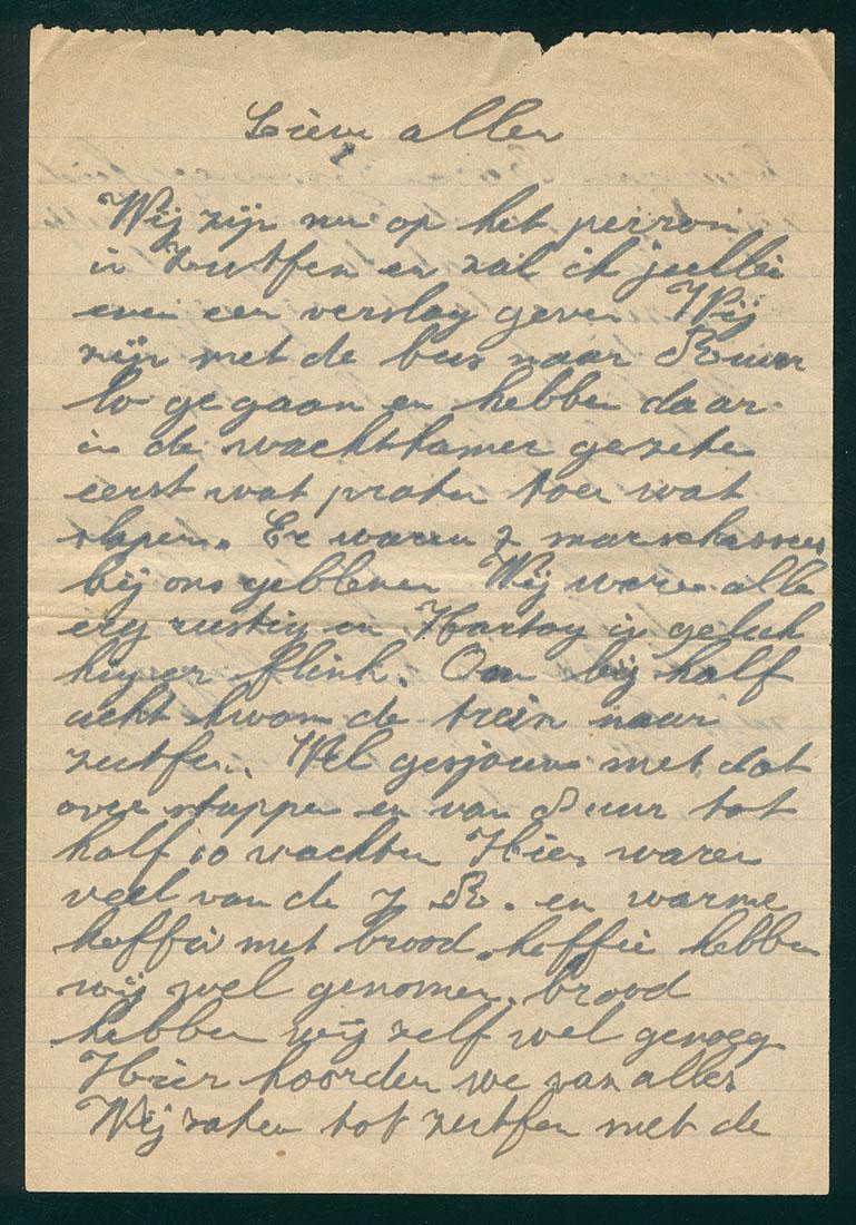 De schenker van deze brieven heeft de volgende transcriptie van de brieven gemaakt: Brief 1 woensdag 18/11/1942 Lieve allen Wij zijn op het perron in Zutfen en zal ik jullie even een verslag geven Wij zijn met de bus naar Ruurlo gegaan en hebben daar in de wachtkamer gezeten eerst wat praten toen wat slapen. Er waren 2 marschassees bij ons gebleven Wij waren alle erg rustig en Hartog is gelukkig er flink. Om bij half acht kwam de trein naar Zutfen. Wel gesjouw met dat overstappen en van 8 uur tot half 10 wachten Hier waren veel van de J.R. en warme koffie met brood. koffie hebben wij wel genomen. brood hebben wij zelf wel genoeg. Hier hoorden we van alles Wij zaten tot Zutfen met de// buurman Bora Brom en kind zijn bij ons in de Coupe In Zutfen hoorde wij dat de gesperden in gezinsverband vrij zijn en is er direct voor gewerkt naar alle kanten opgebeld bij ons vertrek hadden ze nog geen bericht Ook is hier gezegd dat gezinnen waarvan de Vader of Moeder een attest hebben ook de hele huishouding vrij is Ik heb ons hier ook opgegeven misschien hebben we een kleine kans We hebben hier ook alle namen van de landbouwers// Meijer we zijn hier in Deventer en zien hier Jan * Jarentje* en kind. Ook een van Bos met vrouw en 4 kinderen Ik spreek net Bobbie v Spiegel en die zegt het zelfde als in Zutfen die hebben hier de hele nacht gewerkt en hebben van degenen die gesperd zijn of attesten hadden die hebben z* onvervoerbaar gemaakt de hele huishouding vrij gekregen Dus hebben wij toch ook een kans probeer alles te doen dat zal ik ook doen gegroet Betsie en Hartog// Waarde ouders en Meijer en Tante We zitten in de trein en houden goede moed in Zuthfen en Deventer hoeven geen mensen weg waar de Vader van gespert is en een atest hadden daar mocht het gehele huisgezin blijven stel alles in het werk want Vader heeft toch ook een atest. Jac zit ook in de trein. Hel vele kussen jullie Hartog Moed Houden dat doe ik ook hopelijk zien we mekaar gauw weer. Jacibo* was in Ruurlo op het perron Meijer de je best jongen Daaag// Brief 2 donderdag 19/11/1942 Lieve allen, Het is Donderdag ochtend en wil ik jullie even schrijven Ik wil verder gaan van gister Jullie hebben zeker brief ontvangen ook bericht van buurman. Nou tot het kamp gelukkig met de trein dus niet zooveel lopen. Toen naar de rigistratie als opgepakte haringen daar alles afgeven zooals bonnen legitimatiebewijs en stamkaart. Daarvoor kregen we een gele kaart met naam waar alle nummers van barak en bed opgezet worden als je die kwijt bent wordt je direct op transport gesteld dus je begrijpt hoe die bewaart word broodzakken hebben we bij ons gehouden rugzakken werden door een wagen van// de trein gehaald toen naar lidman (Lipmann??) geld afgeven. Daar was het niet te houden zoo vol. Daar werden we bang gemaakt dat als we weg moesten alles waar het ook verstopt was gevonden zou worden. Hartog heeft van hem alles gegeven ik niet de vrouwen moesten alles aan de man geven en konden naar hun barak maar eerst naar de kapper laten zien of je hoofd schoon is. Toen was het donker en overal zoo diep in de in de modder Toen naar je barak en aldoor met je broodzakken sjouwen in al die barakken waar je moet zijn vieze hete lucht overal je kaart afstempele daar komt om 6 uur een meisje of Borculo Meijer Godschalk er is Hannij v Adelsberg ik keek op en was blij iemand// te spreken die bekend was die heeft me ook ingelicht ook kwam Lion de Vries uit Meppel met vrouw wij zijn aardig ingelicht ik zit hier gevaarlijk te schrijven want het mag maar om de 14 dagen toen kregen we om 9 uur aardappelpure de mannen kwamen als laatste om half 4 Meijer ik heb de hele nacht heen en weer gelopen met het een en ander en heb direct de mannen gesproken toen ze binnen kwamen moest niet heb het gedaan en hielp toch Hartog is koffie en etens drager/ ik hoop we niet bij het transport van morgen bij zijn stuur als je kan eten en rantsoen bonnen we// hebben nog wel maar krijgen zooals Hannij geschreven heeft Nu zijn z vanmorgen bij de JR geweest voor de boeren en moeten om een uur weer terug komen ik hoop het helpt Bora maakt groote kans[.] Stuur even bericht naar Bora haar huis in Rijsen dat ze pakjes sturen naar Erich ter Hooy voor Bora geef bij alle de groete van allemaal ze zijn alle flink als we niet morgen weg gaan schrijf ik nog wel Houd jullie goed wij doen van alles[.] Hennij is hier en geef ik de brief mee geef je alle de briefjes ze hebben alle niet bijgeschreven omdat ze het niet alle weten vele groete en tot gauw weerzien. [bovenaan de pagina bijgeschreven] wij hooren de goede berichten// Nu ga ik weer verder wij zijn nu Zwolle gepasseerd en hebben daar Oom Hartog aan de trein getroffen en was [onleesbare passage] verschillende … daar ook … Ook was Winterswij er en Doetinchem. Wike* hebben we gesproken toevallig was die in het rusthuis. Was hij thuis geweest had hij … hier …/ Uit Doetinchem hadden we nog niemand gesproken alleen Bettie en Horst gezien Maar die zien we straks wel. In alle plaatsen is het hetzelfde geweest alles of niets uit gezin. In Zwolle hebben ze ook nog weer verschillende namen op genomen voor de fam[ilie] van de gesperde ook voor de// boeren. Nu zullen wij ons best doen doe jij dat ook maar. Meijer als je had gezien wat overal door de gesperde leden van de J.R. word gedaan is er ongelukkig genoeg bij ons niets gedaan Ik hou nu weer maar op want we zijn bijna in bijlen van daar zullen we moeten lopen Nu jongens houd je goed hoor Wij schrijven nog wel Hartelijke groeten ook van Hartog die gelukkig heel flink is de mezomme heb ik nog in genaaid er zijn hier veel kennissen* Daaaag] Brief 3 [rond 25/11/1942] Lieve Meijer Deze brief is apart voor jou Vrijdagavond is Hartog met zijn hoofd tegen de muur gelopen en heeft zijn neus en hoofd bezeerd een hele lichte hersenschudding ik heb de hele nacht en sabbaht bij hem gezeten en is hij bijna aldoor bewusteloos geweest om ongeveer 4 uur sabbaht is hij naar het ziekenhuis gegaan en is daar opgenomen nu gaat he