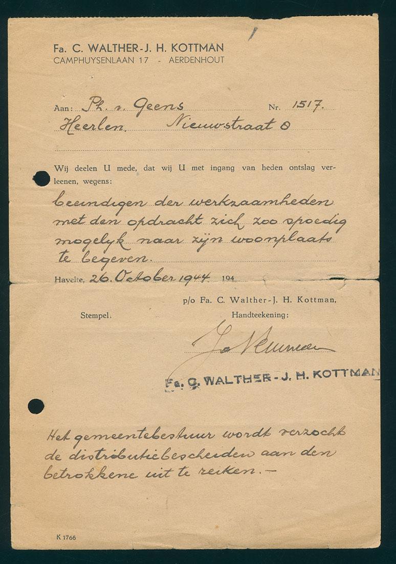 Ontslagbewijs van Philip van Geens uit het werkkamp voor ongehuwden te Havelte met een door hem vervalste handtekening, 1944