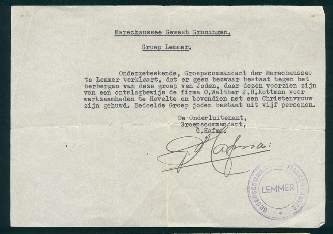 Verklaring van de Marechaussee dat er geen bezwaar is tegen het herbergen van een groep van ontslagen en gemengd gehuwde joden uit Havelte, 1944