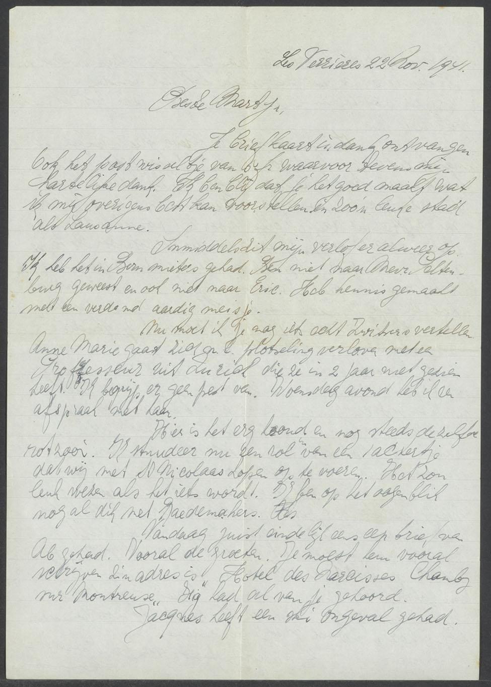 Inhoud o.a. 1. brief van Herman Fuldauer, 22 november 1941 2. idem, april 1942 Rest van de brieven, briefkaarten en enkele telegrammen is uit het jaar 1943. Ze liggen op datum. Veel brieven zijn in de Franse taal, o.a. van Paulette Rodieux. Verder van tante Paula uit Eindhoven, van Chris uit Eindhoven, die in de brief van 15 februari 1943 schrijft over een bombardement en dat hij voor het Rode Kruis heeft gewerkt en daklozen heeft verzorgd. Ook veel brieven van (neef) Herman Fuldauer. Enkele brieven van Frans (en Nel) Nienhuijs en eveneeens van de halfbroer van Martijn Fuldauer, Jacob of Jacques Delmonte. In de brief van 12 mei 1943 schrijft Frans Nienhuijs over Nol Nabarro, die bij een bombardement op Haarlem is omgekomen. Ook denkt hij erover om als voordrachtskunstenaar op toernee te gaan langs Nederlandse werkkampen. Verder enkele brieven van Mia Peltenburg en van Germaine Mol uit Portugal in de Franse taal.