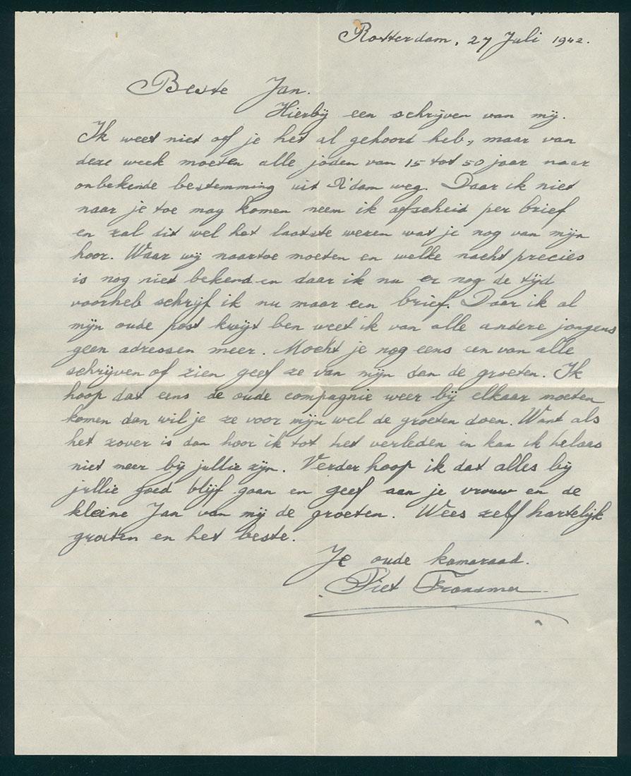 Afscheidsbrief van Pinas (Piet) Fransman aan zijn vriend Jan van Kempen kort voor zijn deportatie geschreven, 1942