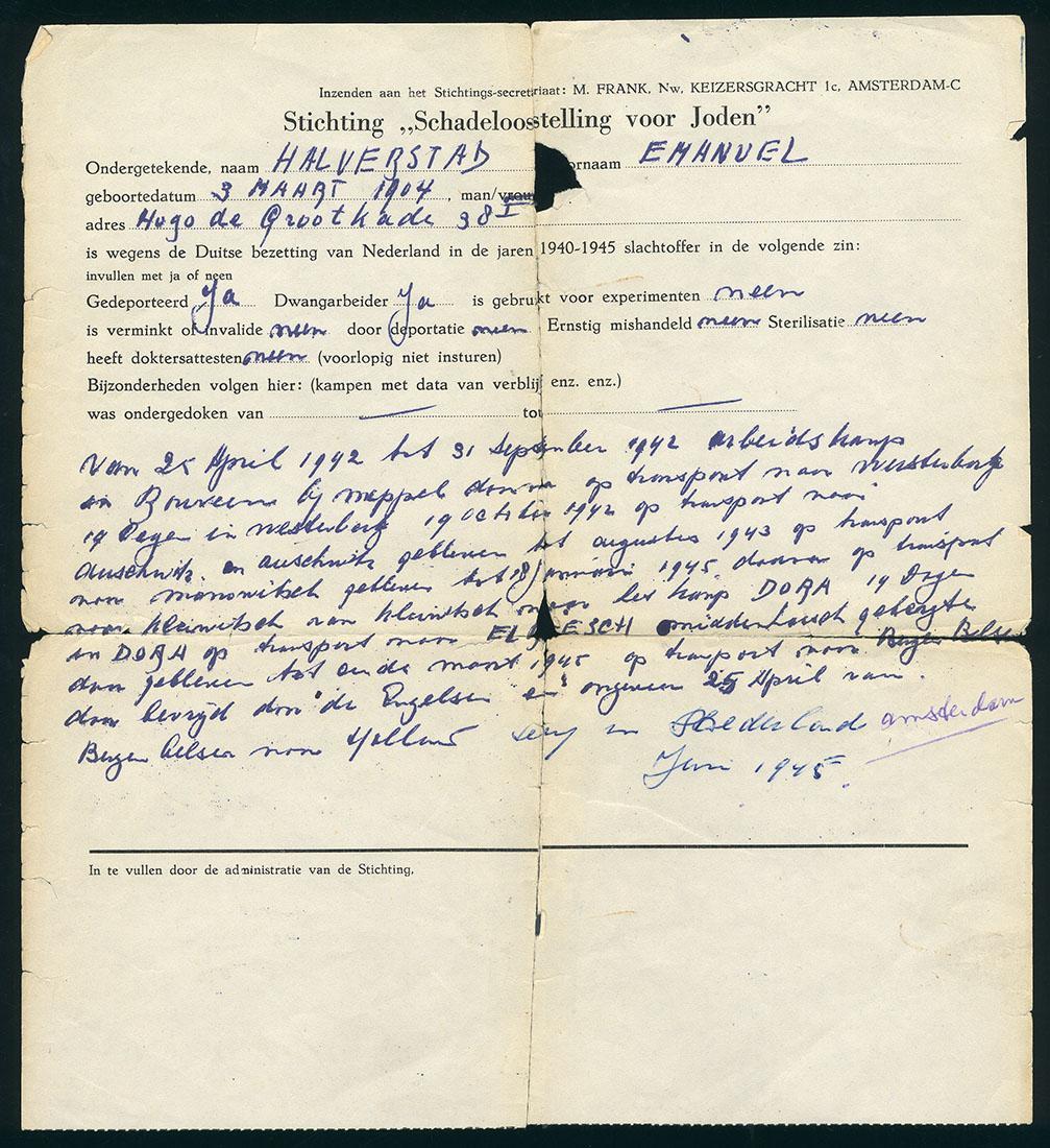 Korte verklaring van Emanuel Halverstad over zijn deportatie naar diverse concentratiekampen t.b.v. de Stichting Schadeloosstelling voor Joden, juni 1945