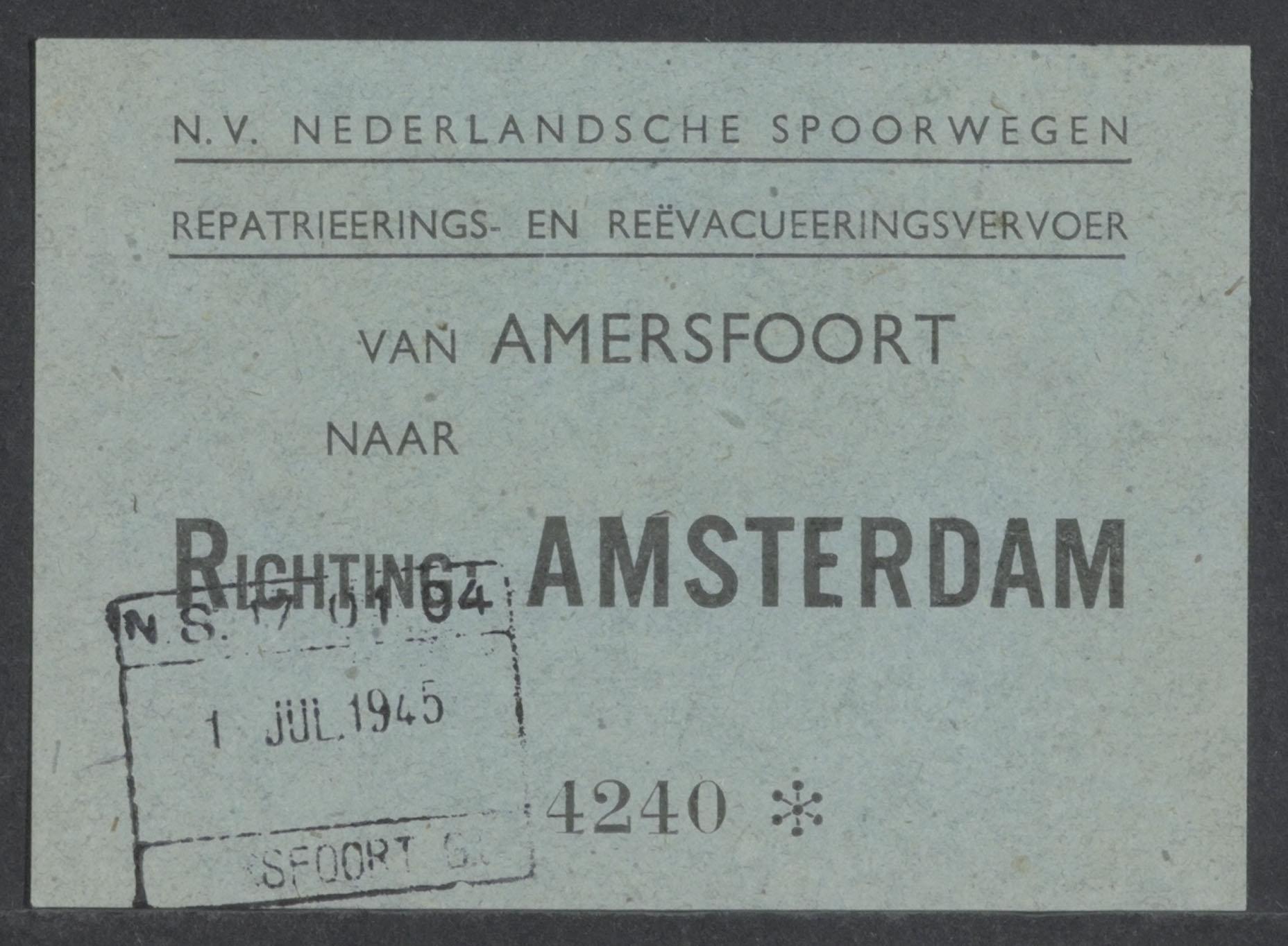 Inhoud o.a.: - twee treinkaartjes van Amersfoort naar Amsterdam betr. repatriërings-en reëvacueringsvervoer, 1 juli 1945 - bagagelabel Repatriëringsdienst en evacuatiedienst Limburg - Registratiekaart AEF DP (origineel) Militair Gezag Repatriëring Sittard, 21 juni 1945 - brieven en enveloppe van het Afwikkelingsbureau Concentratiekampen inzake distributie. Met aantekeningen van Michaël Lopes de Leao Laguna over zijn (blinde en dove) zuster Rachel, die in de Joodsche Invalide woont, 23 september 1945 - Aanmeldingskaart, juni 1945, voor gerepatrieerden, inspectie der repatriëring Amsterdam, met stempels en bonkaarten voor tabak (1948-1950) - Informatiekaart Dienst der Repatriëring: Michaël Lopes de Leao Laguna kwam op 26 juni 1945 aan in Sittard en op 29 juni 1945 in Amsterdam, waar hij in de Waalstraat 111 3 hoog ging wonen - envelopje met brief bewijs van registratie van vreemd geld en biljetten van 5, 10, 50 en 100 Tsjechische Kronen (Protektorat Böhmen und Mähren), 11 juli 1945 - brief van Michaël Lopes de Leao Laguna aan het hoofd van het Afwikkelingsbureau Concentratiekampen inzake extra levensmiddelen, 6 november 1945 - stencil van Afwikkelingsbureau Concentratiekampen Den Haag aan zijn zuster Rachel (verwarring in de namen) Lopes de Leao Laguna inzake extra levensmiddelen.