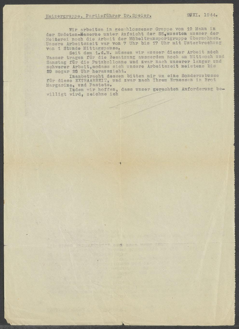 Emanuel Speijer schrijft dat ze als groep van 19 personen in de Sudeten-Kazerne onder toezicht van de SS als stokers werken, maar tevens ook nog het werk van de meubel-transport-groep moesten overnemen. Sinds de eerste van de maand november moeten ze ook nog het water dragen voor het personeel alsook op woensdag en zaterdag voor de schoonmaakploeg. Dit alles maakt dat ze vele overuren maken. Daarom verzoeken ze voor dit extra werk een beloning in natura in de vorm van extra brood, margarine en paté. Ondertekend (bijna niet meer te lezen) door E.A.M. Speijer.
