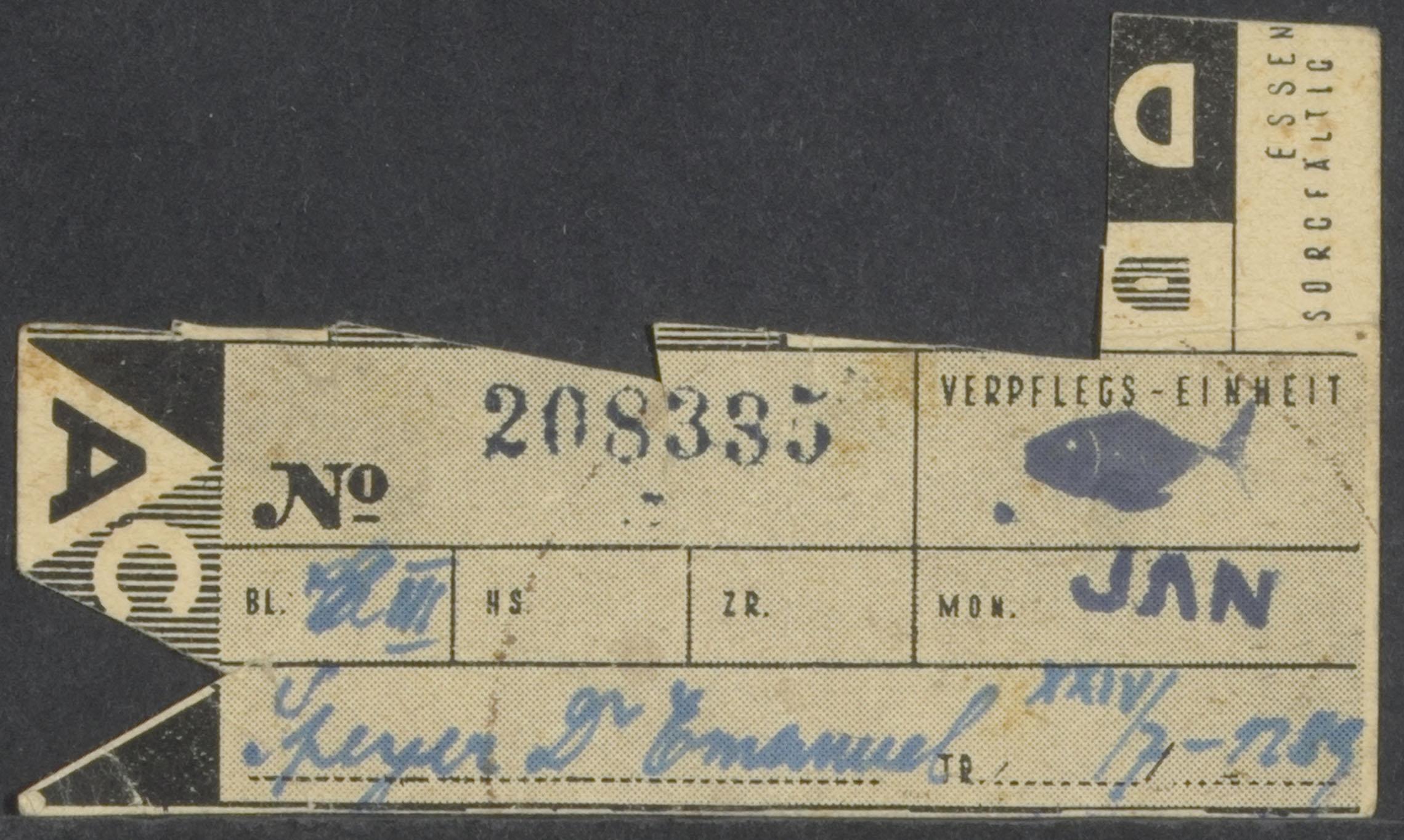 Inhoud: 1. Bezugs-Schein van mw. Elisabeth Speijer-de Vries 2. Schwerarbeiter-Zusatzkarte; op achterkant: Postbaracke Dr. Emanuel Speijer 3. Essenkarte februari 4. Essenkarte april 5. Deel van een Essenkarte