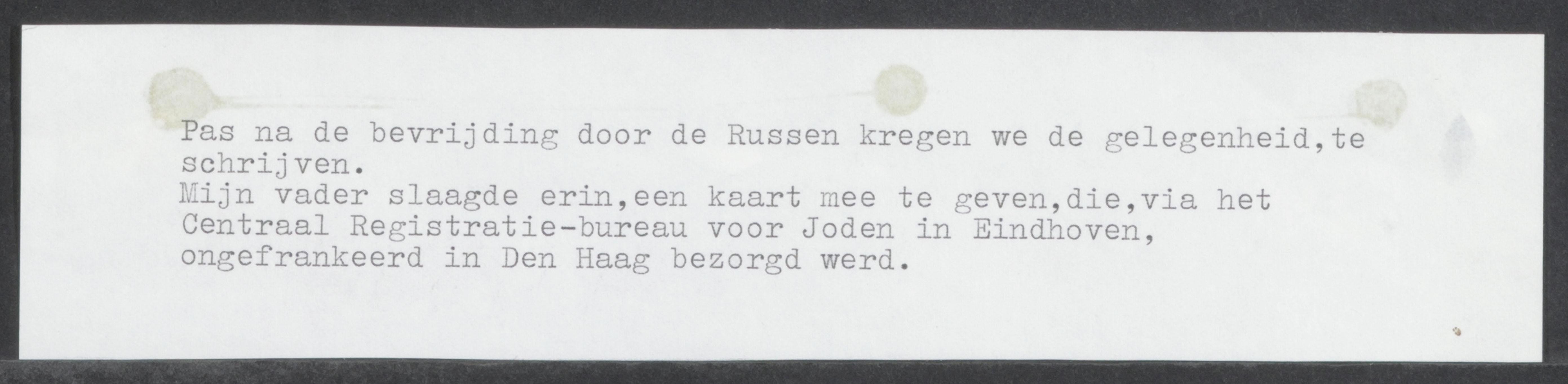 Dr. E. Speijer schrijft als uitleg: "Pas na de bevrijding door de Russen kregen we de gelegenheid te schrijven. Mijn vader slaagde erin een kaart mee te geven, die, via het Centraal Registratie Bureau voor Joden in Eindhoven, ongefrankeerd in Den Haag werd bezorgd."