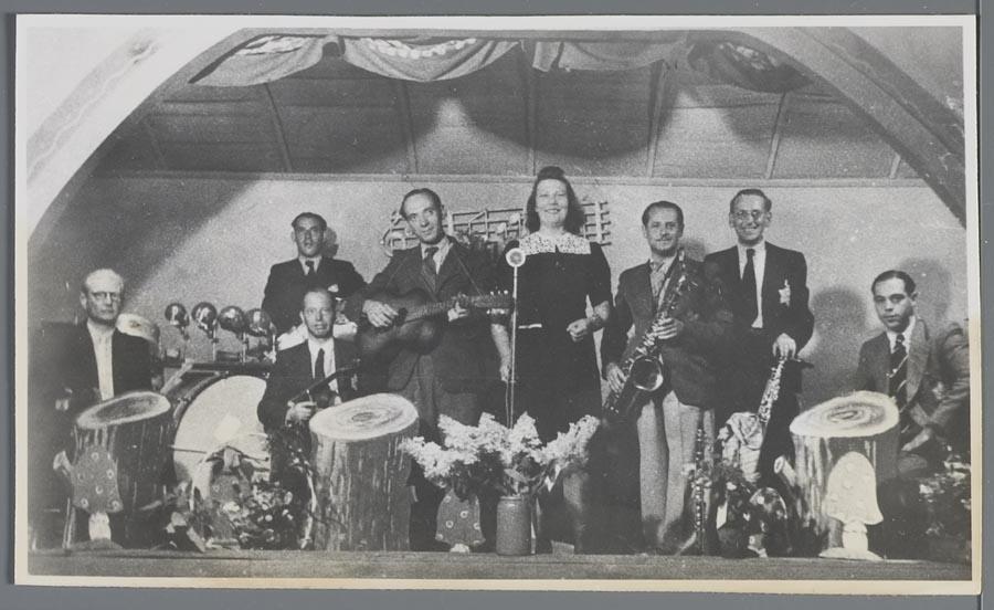 Groepsfoto van een orkestje in Westerbork waarvan de leden jodensterren dragen, 1942