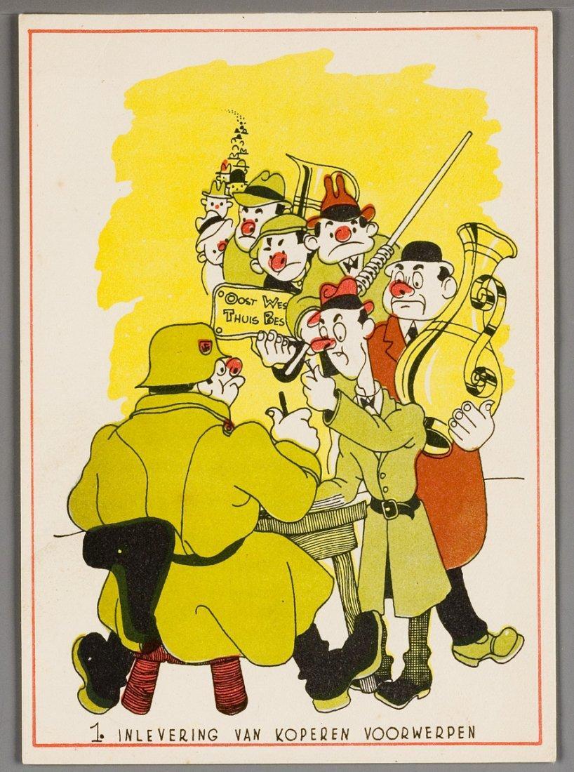Anti-Duitse spotprenten (7) uit de Tweede Wereldoorlog over inleveringsplicht (koper, textiel, radiotoestellen, mensen), broodrantsoen, inundatie (geforceerde overstroming) en de bevrijding, 1940-1945