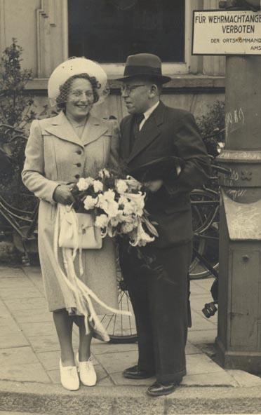 Trouwfoto van Jaap van Amerongen en Loes Asscher staand voor een bord met de tekst "Für Wehrmachtangestellten verboten", 1940
