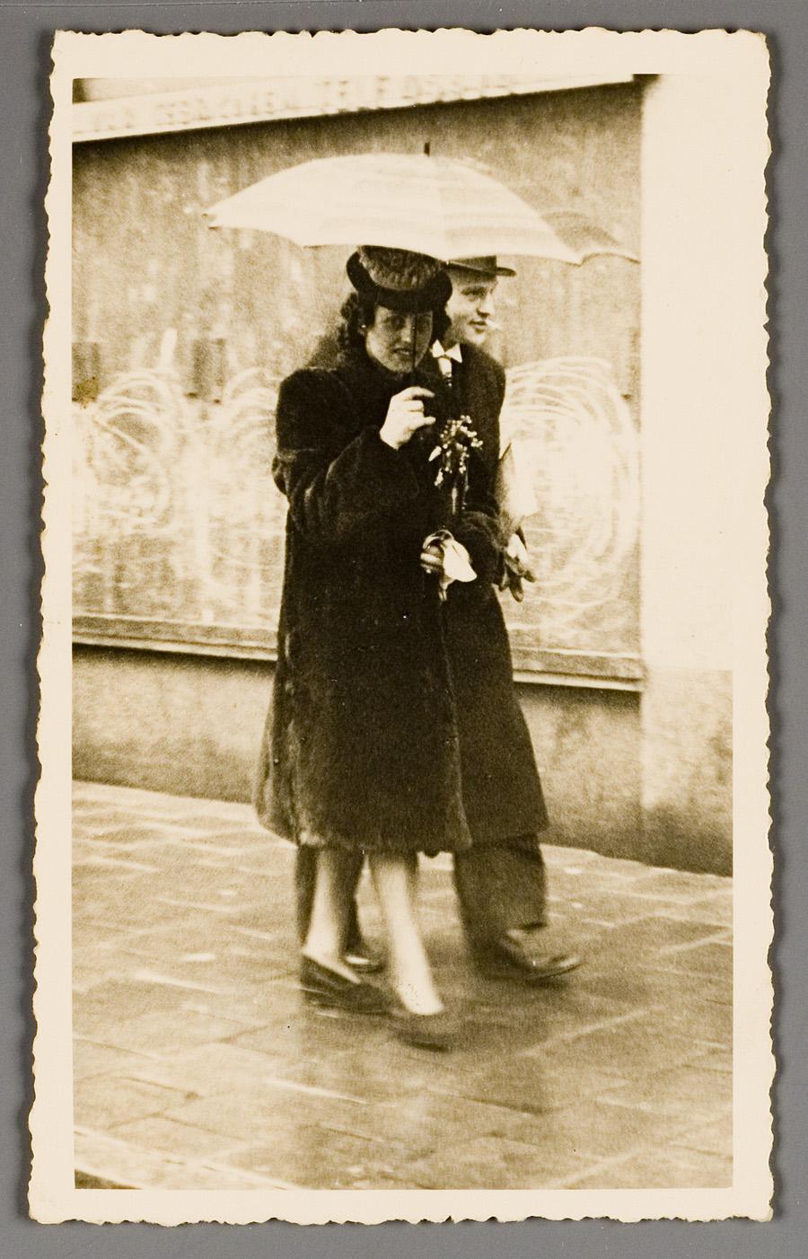 Ephraïm Content en Maria Leever lopend op straat door de regen op de dag van hun huwelijk op 31 maart 1942