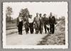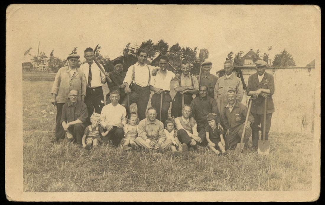 Foto van vijftien mannen in een werkkamp, waarvan twee met gele jodenster, poserend met kleine (buurt?)kinderen, omstreeks 1942
