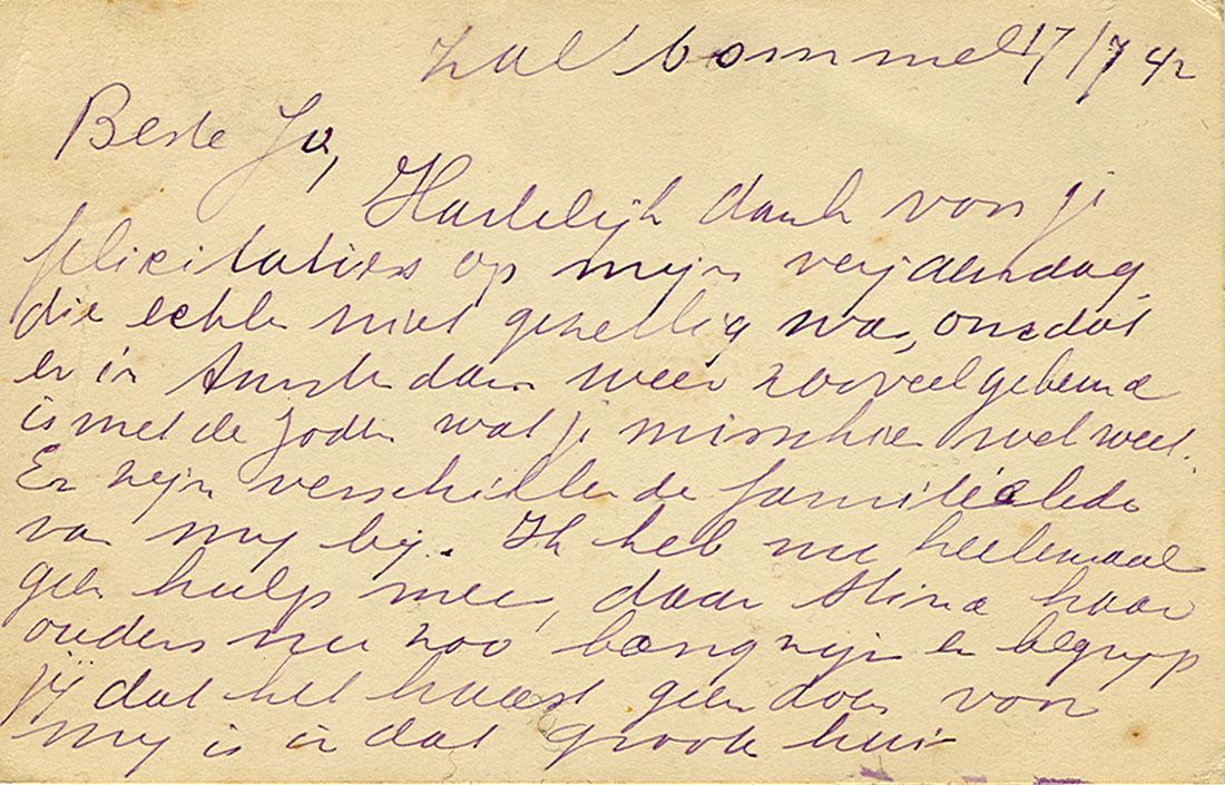 Foto's (2) van correspondentiekaart, geschreven door Crisje Joosten-Blom aan Johanna Maria Yda Beckerman (Jo). Zij bedankt voor de felicitaties voor haar verjaardag en spreekt haar zorgen uit over wat er met de joden in Amsterdam (waaronder familieleden van haar) is gebeurd, 17-7-1942, Zaltbommel.