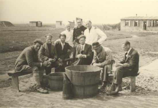 Salomon de Zwarte (rechts in witte jas), in een werkkamp, vermoedelijk 't Zand, 1944