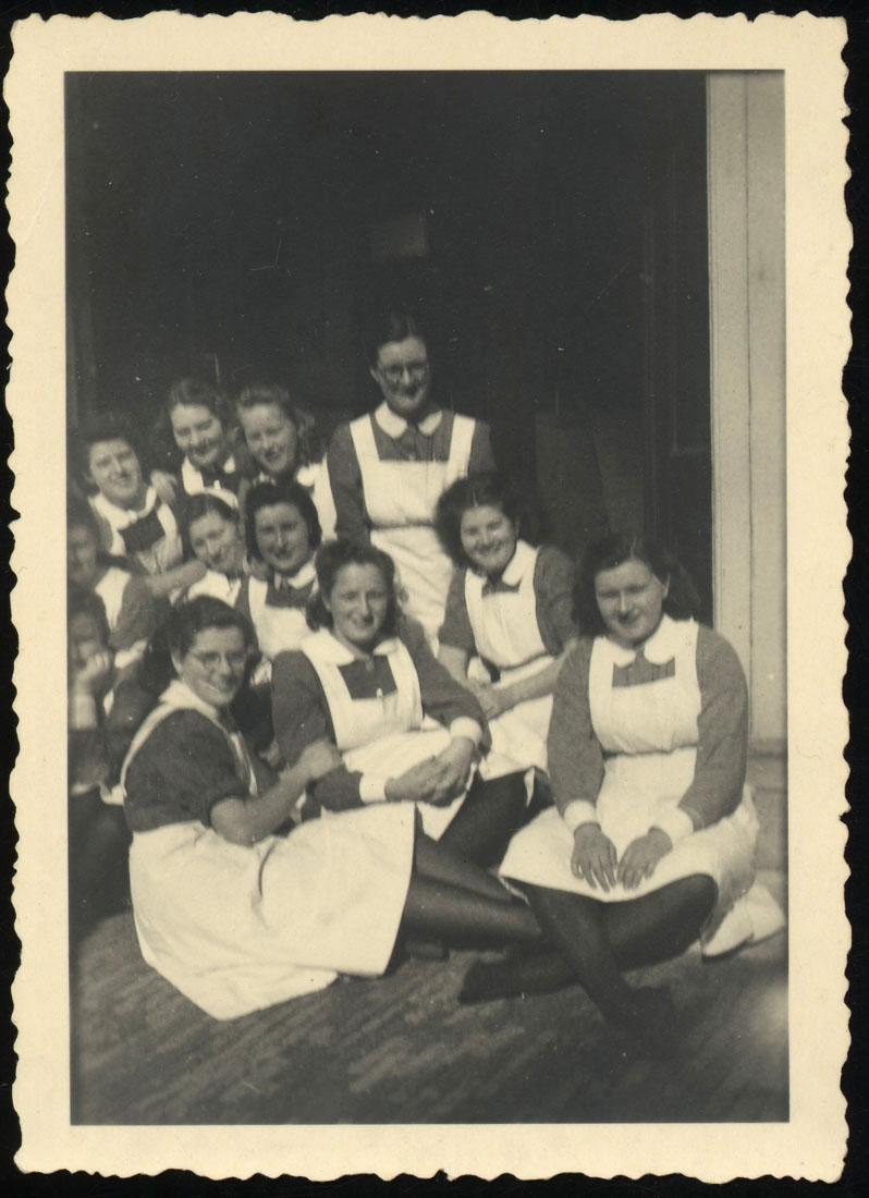 Groepsfoto met Hannie van der Hoeden (zittend tweede van links) tijdens haar onderduik in het Sint Jansgasthuis in Hoorn waar ze zat onder de naam Els van Seldam, 1942