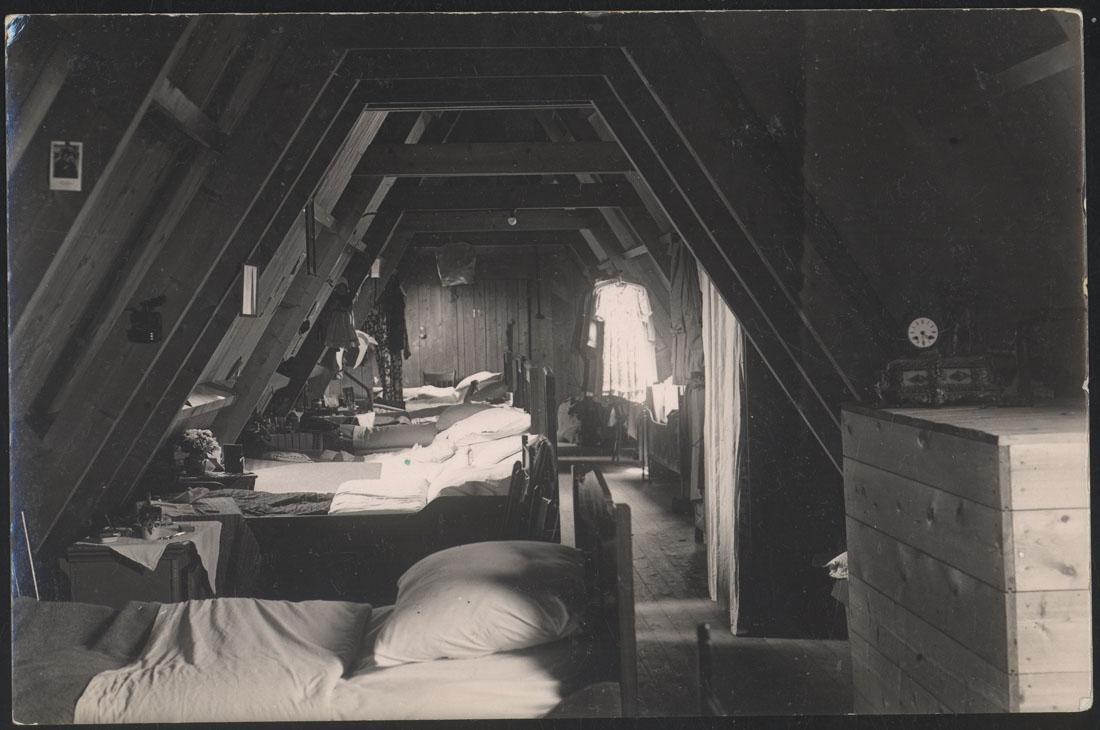 De zolder van het Sint Jansgasthuis in Hoorn met enige slaapplaatsen waar Hanna van der Hoeden tijdens haar onderduik sliep, 1942