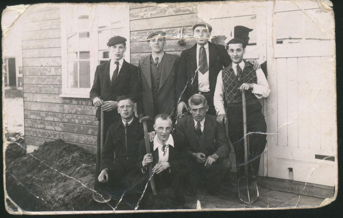 Groepsfoto gemaakt in werkkamp Sellingerbeetse met onder andere Salomon Suesan (staand tweede van rechts), ca. 1942