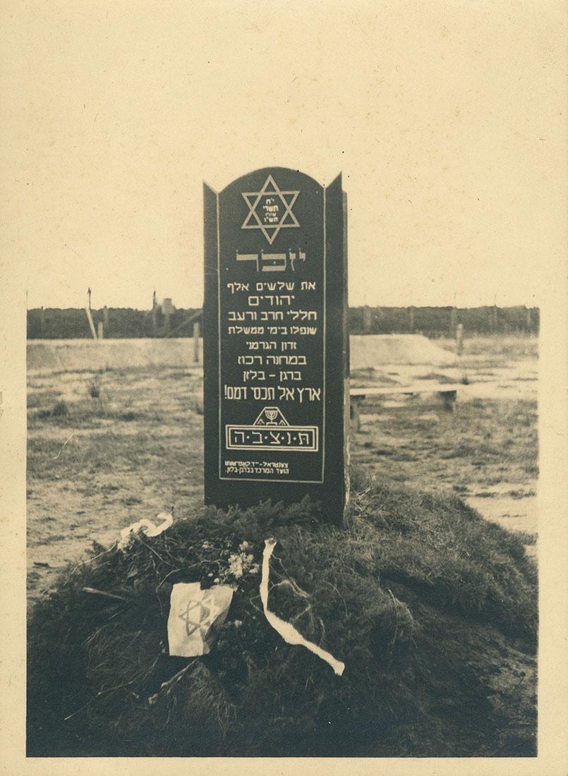 Foto's (2) van twee monumenten in concentratiekamp Bergen-Belsen, die herinneren aan de 30.000 Joden die daar zijn vermoord, 1945-1946