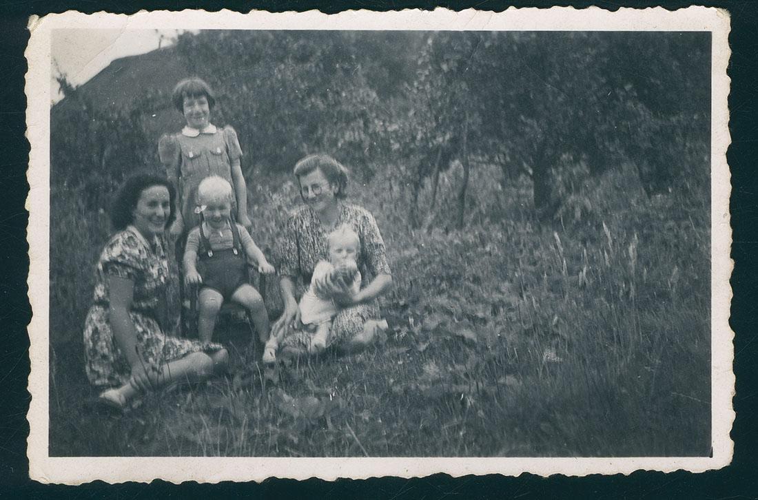 Susi Schloss (1928-2001) zittend in de tuin bij de familie Princen tijdens haar onderduik in het buurtschap Koolwijk in de omgeving van Oss, 1944