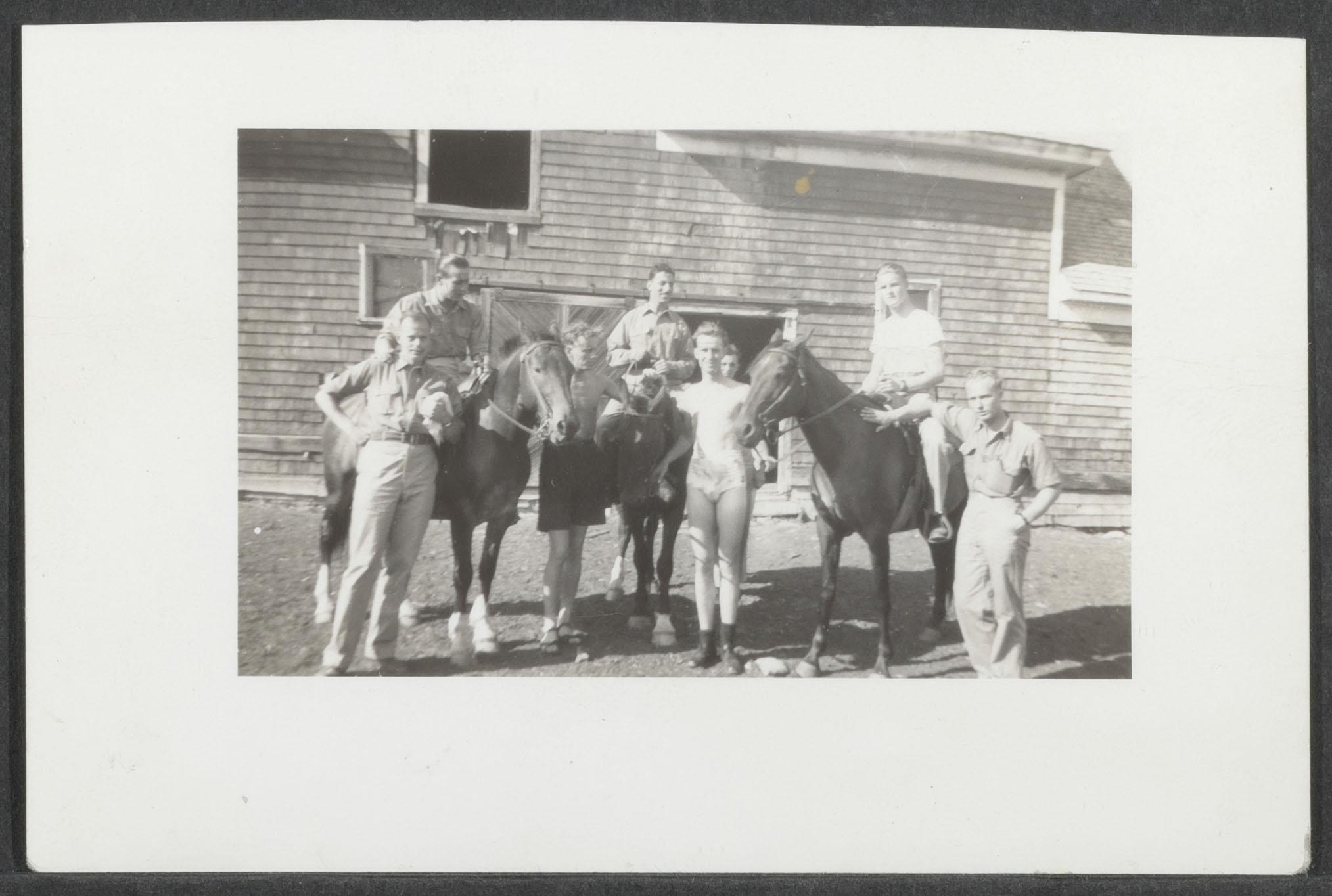 Inhoud: 1. Paul van Hessen (?) zittend in zwemkleding op een hoop stenen 2. Twee mannen op twee paarden 3. Drie personen op drie paarden, een van hen Wylong (?) 4. (2x) Drie paarden en zeven personen, namen achter op de foto: Slosser (Schlösser), Bouman, Rob Wylong (of Wyling?), Hamminga 5. portretfoto van Paul van Hessen in burgerkleding 6. (2x) portretfoto van sergeant Collins, instructeur De Winton (Alberta) augustus 1943, met een sigaret in de hand en op de achtergrond een vliegtuig en auto