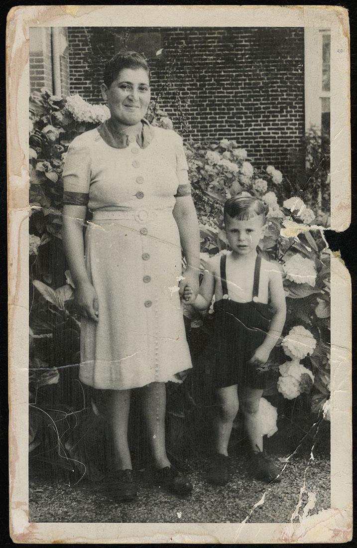 Marianne Samson-de Groot en haar zoontje Levi Samson op de binnenplaats van het bejaardenhuis, hoek Amstel en Nieuwe Herengracht, na hereniging in juni 1945.
