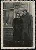 Overzichtsfoto met Meier Leib Kranz, zijn vrouw Henne Kranz-Brummer staand voor een barakachtig gebouw mogelijk in Westerbork, ca. 1940