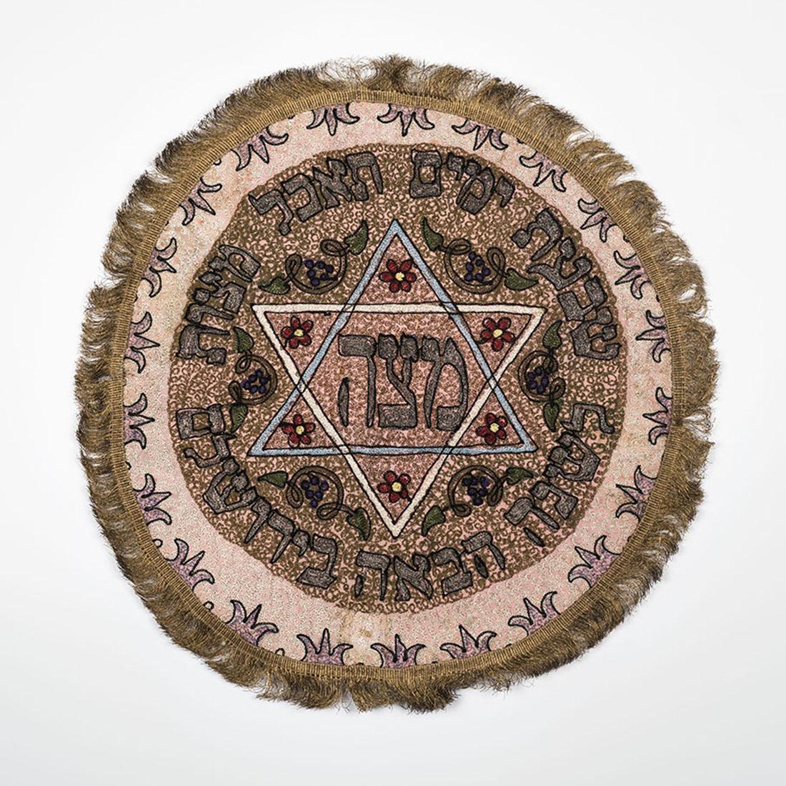 Matzekleedje van borduurzijde, vermoedelijk vervaardigd tussen 1920 en 1939 in Jeruzalem bij de Bezalel Academy of Art and Design. Het rijk gedecoreerde matzekleedje is geborduurd met een davidster, met daarin in het Hebreeuws het woord "matze" en rondom de teksten "zeven dagen zult gij ongedesemd brood eten" [Deuteronomium 16:3] en "tot het volgend jaar in Jeruzalem". Het kleedje voor het op tafel afdekken van de matzes heeft aan de onderzijde vier aan elkaar genaaide lagen van linnen voeringstof. Hierdoor worden drie vakken gevormd voor de matzes die deel uitmaken van de hagada (sederavondviering) en die geborduurd zijn met de daarbij behorende aanduidingen Cohen, Levi en Israël. Het in 1984 aan het museum geschonken kleedje is gevonden in de schuilkelder van het ouderlijk huis van de schenker (evenals JHM M002176-M002177) en is vermoedelijk afkomstig van een Joodse familie uit Amsterdam-Zuid.