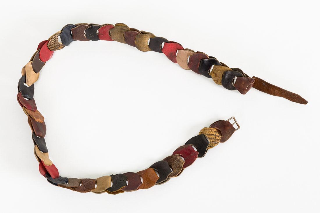 Ceintuur vervaardigd van aan elkaar geschakelde stukjes leer in diverse kleuren en patronen.