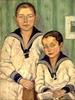 Interieur met twee kinderfiguren in matrozenpakjes en face, halffiguren, de rechter en kleinste zittend in een fauteuil met opengeslagen boek op de knieen. Geheel rechts een schilderij.