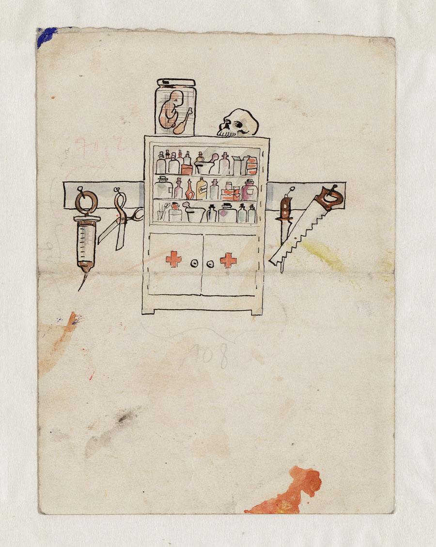 Decor voor 'Der Patient': kast met potjes en flessen, op de kast een schedel en een pot met een embryo. Aan de wand hangen een injectiespuit, een schaar, een mes en een zaag.