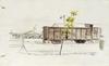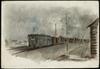 De laatste wagon van een trein met opschrift 'DEUTSCHE/REICHS- BAHN/STETTIN/90333/R.A.W.'. Op de voorgrond een heldergroen boompje, op de achtergrond een barak en een man met kruiwagen.