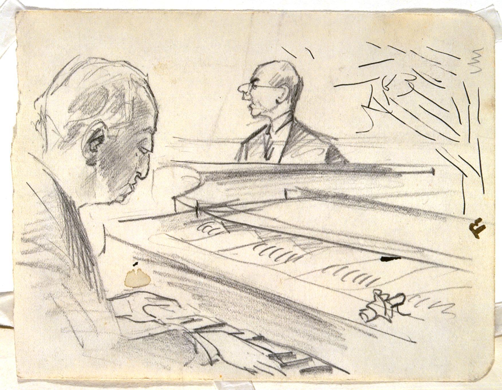 Links voor Erich Ziegler ter halver lijve zittend en profil naar rechts aan een vleugel. Middenachter de vleugel Willy Rosen met bril, borststuk en profil naar links.