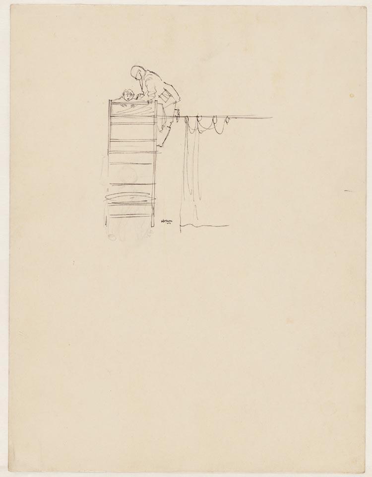 Kind, hoofd en face, bovenop een stapelbed gezien vanaf het hoofdeinde. Op het bed is een arts geklommen, ten voeten uit en profil naar links, die het kind met een stethoscoop onderzoekt. Verso: potloodschets van een man, ten voeten uit staande en trois quart gebogen naar links.