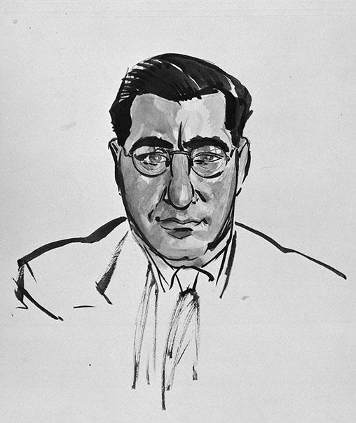 Man, borststuk en face, met bril en stropdas. De schouders zijn schetsmatig uitgewerkt.
