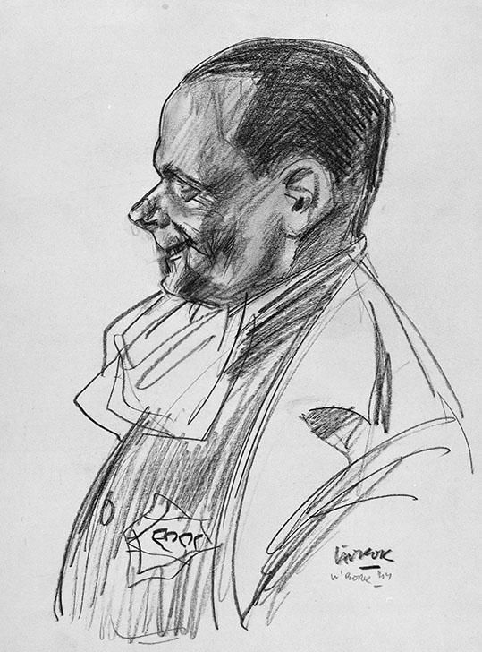 Lachende man, borststuk en profil naar links, met een bef voor en een verkeerd om zittende jodenster op de borst.