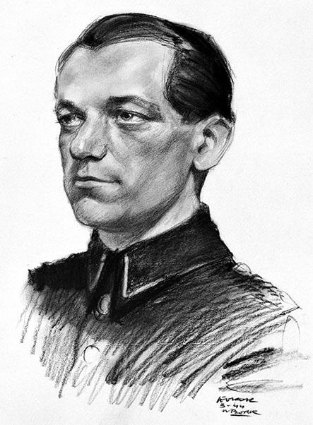 Marechaussee in uniform, borststuk en trois quart naar links.