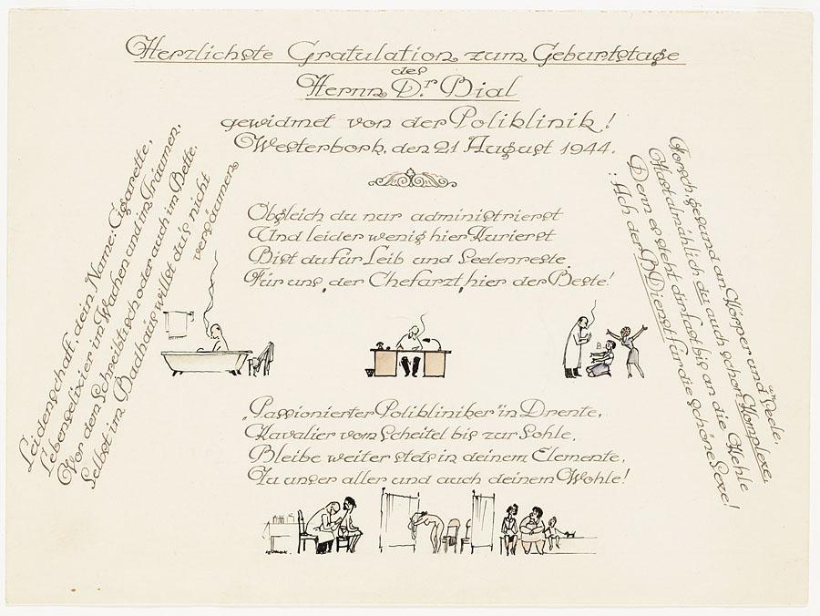 Vier taferelen uit het leven van dr. Bial, vlnr: De dokter in een badkuip, borststuk zittend en profil naar links. De dokter werkend aan zijn bureau, ten voeten uit zittend frontaal. De dokter, ten voeten uit staande naar rechts, met zijn handen in een afwerend gebaar geheven tegenover twee vragende (smekende ?) vrouwen ("B"). De dokter aan het werk in de praktijk, ten voeten uit zittend en profil naar rechts, terwijl hij een half ontklede vrouw op de rug met een stethoscoop beluisterd. Achter een kamerscherm kleedt een vrouw zich uit, achter het volgende kamerscherm zitten twee vrouwen en een kind op een bank te wachten. In de drie eerste scenes rookt de dokter een sigaret.