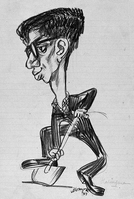 Karikaturale voorstelling van een man, ten voeten uit staande en trois quart naar links, die een spade in de grond steekt. Hij draagt een overall en een bril.
