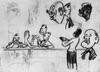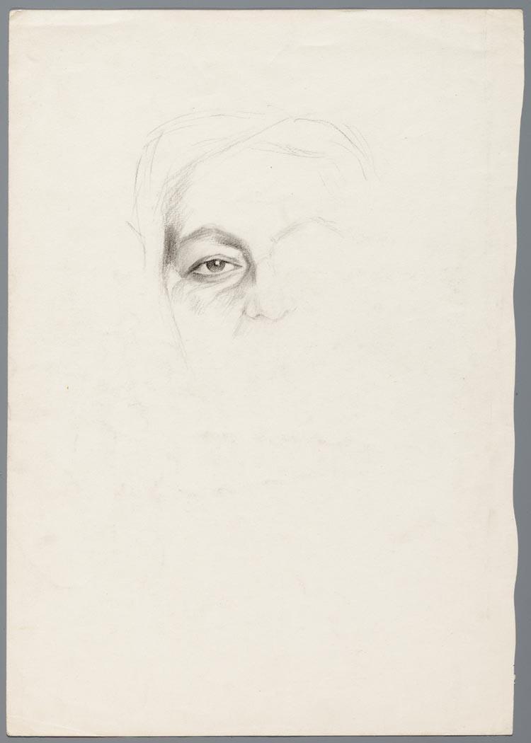 Gedeeltelijke opzet voor een vrouwsportret, en face. Alleen het oog is enigzins uitgewerkt. Verso: schets van een mansportret en profil naar links,met snor.