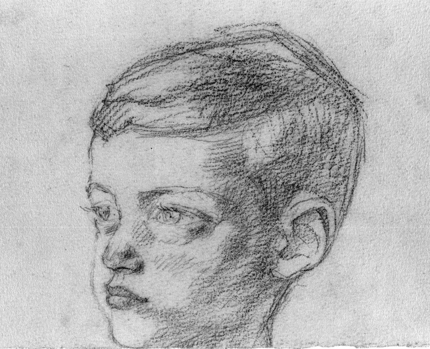 Jongen, hoofd en trois quart naar links. Verso: jongen, hoofd en trois quart naar links, lachend. (Bij beide portretten is het papier net onder de kin afgescheurd.)