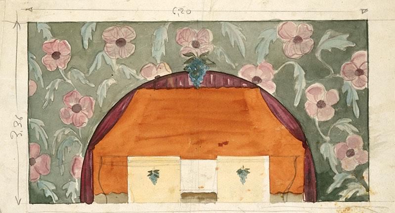 Twee bedden frontaal, staand voor een oranje 'hemel' met een druiventros in het midden. Op de muur behang met grote roze bloemen.